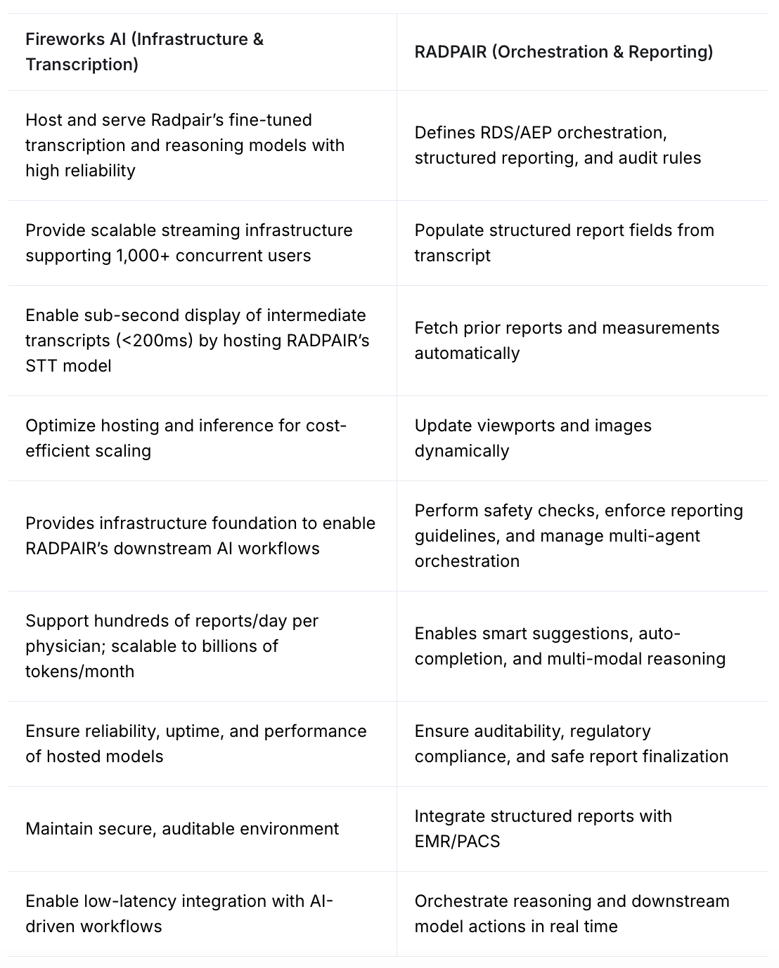 Fireworks AI (Infrastructure & Transcription)RADPAIR (Orchestration & Reporting)Host and serve Radpair’s fine-tuned transcription and reasoning models with high reliabilityDefines RDS/AEP orchestration, structured reporting, and audit rulesProvide scalable streaming infrastructure supporting 1,000+ concurrent usersPopulate structured report fields from transcriptEnable sub-second display of intermediate transcripts (<200ms) by hosting RADPAIR’s STT modelFetch prior reports and measurements automaticallyOptimize hosting and inference for cost-efficient scalingUpdate viewports and images dynamicallyProvides infrastructure foundation to enable RADPAIR’s downstream AI workflowsPerform safety checks, enforce reporting guidelines, and manage multi-agent orchestrationSupport hundreds of reports/day per physician; scalable to billions of tokens/monthEnables smart suggestions, auto-completion, and multi-modal reasoningEnsure reliability, uptime, and performance of hosted modelsEnsure auditability, regulatory compliance, and safe report finalizationMaintain secure, auditable environmentIntegrate structured reports with EMR/PACSEnable low-latency integration with AI-driven workflowsOrchestrate reasoning and downstream model actions in real time